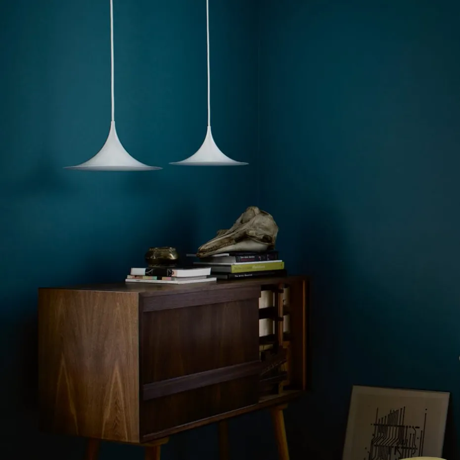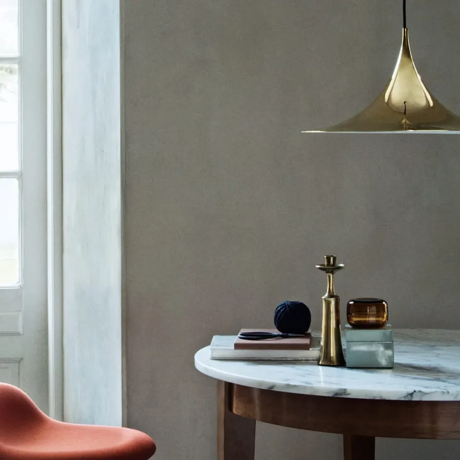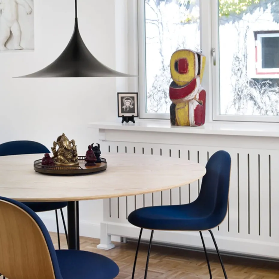 Die Semi Leuchte von Gubi ist ein echter skandinavischer Klassiker. Das einzigartige Design der Leuchte ist aus einer Zusammenarbeit der beiden Architektur Studenten Claus Bonderup und Torsten Thorup entstanden. Die sehr individuelle, trumpfförmige Form der Leuchte wurde durch zwei mit dem Rücken aneinander liegenden Halbkreisen inspiriert. Die Leuchte mit ihrer natürlich fließenden Form aus emailliertem Metall wurde zum sofortigen Erfolg und ist bis heute ein dänischer Design Klassiker.