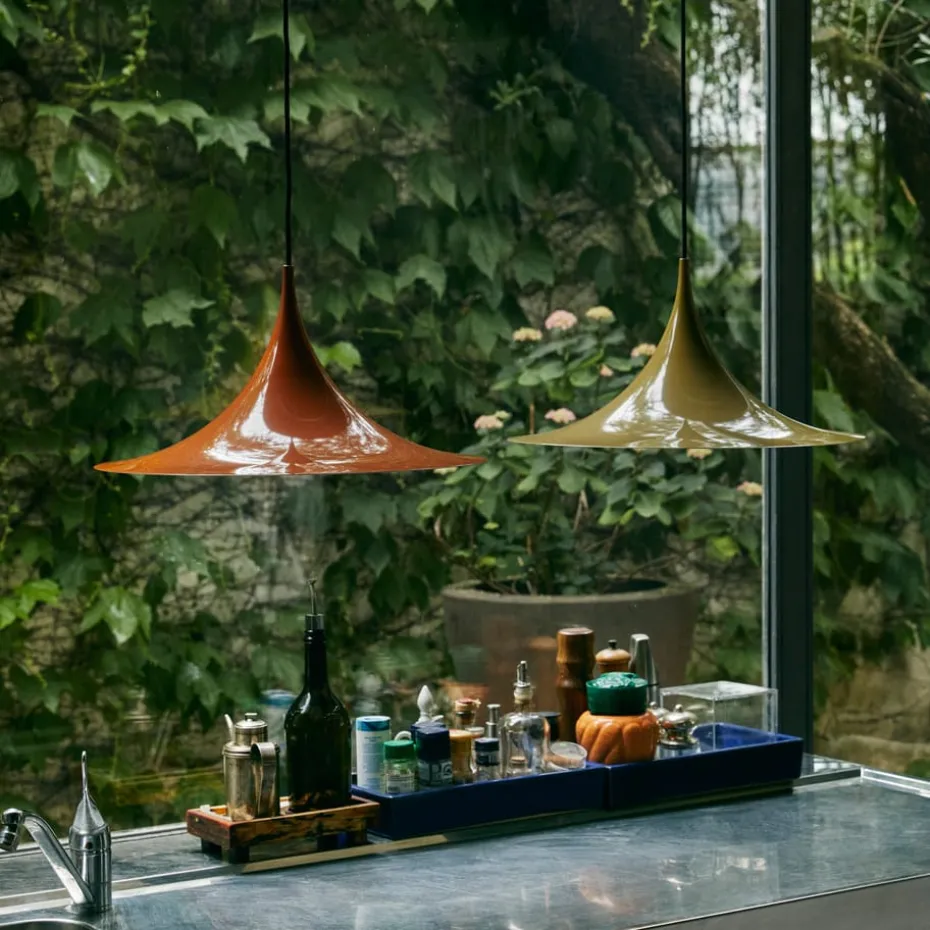 Die Semi Pendelleuchte ist ein skandinavischer Designklassiker, der 1968 von den beiden Designern Claus Bonderup und Thorsten Thorup entworfen wurde. Zu dieser Zeit ließen sich die beiden vor allem von geometrischen Formen wie Kreisen, Quadraten und Dreiecken inspirieren. Semi – daher auch der Name – ist eine Pendelleuchte, dessen Lampenschirm beim Betrachten von vorne die Form zweier Viertelkreise hat.