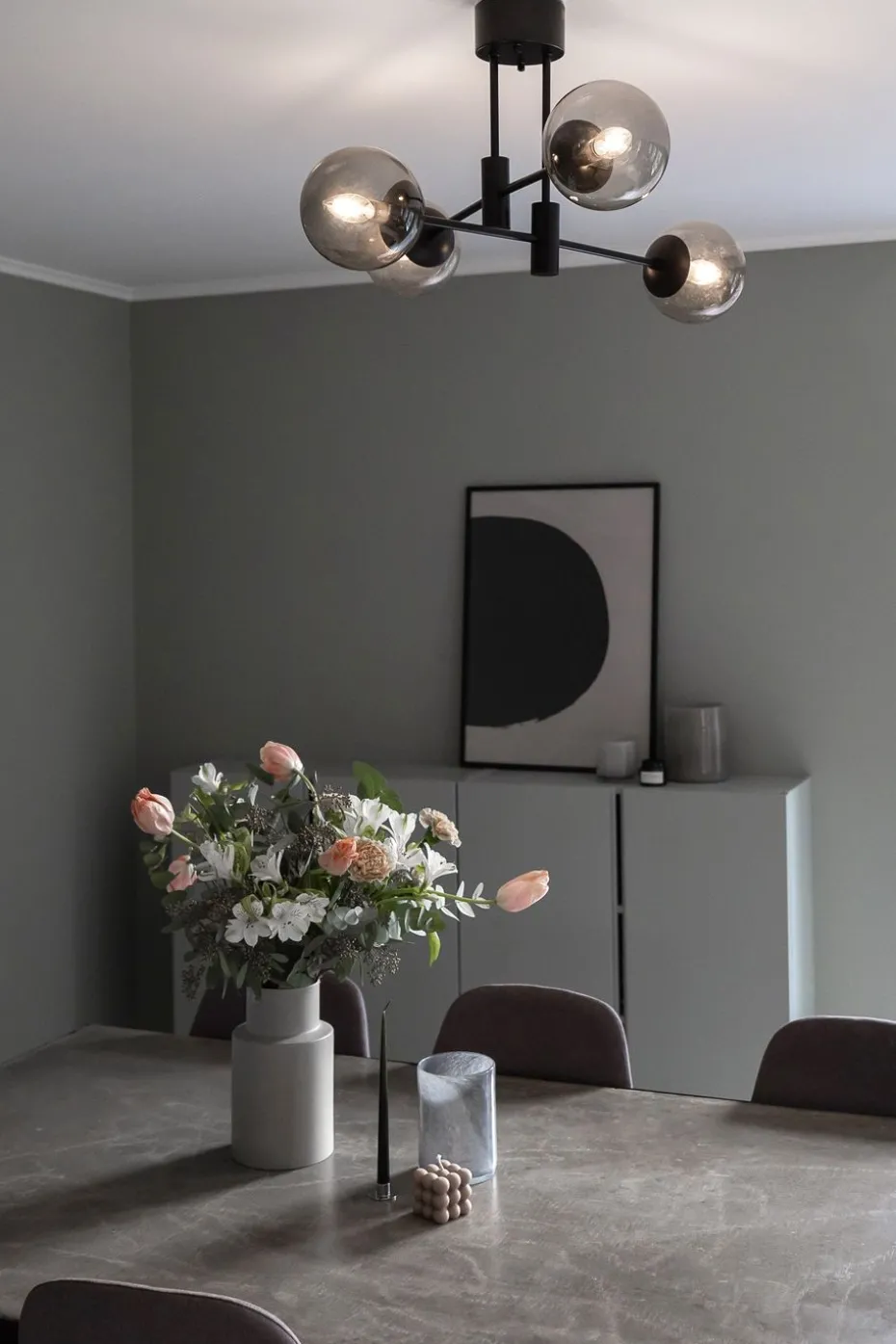 Die schwarze Solar Pendelleuchte 73 cm der schwedischen Marke Scandi Living ist eine große schwarze Leuchte aus Eisen, mit vier Armen, die auf zwei verschiedenen Höhen angebracht sind. Die Arme sind zudem entgegengesetzt ausgerichtet und an jedem Arm befindet sich eine kugelförmige Glasglocke. Die Pendelleuchte sorgt für eine gute Rundum-Beleuchtung und ist mit ihrem auffälligen Design sowohl im Wohn- und Schlafzimmer, als auch über dem Esstisch toll.