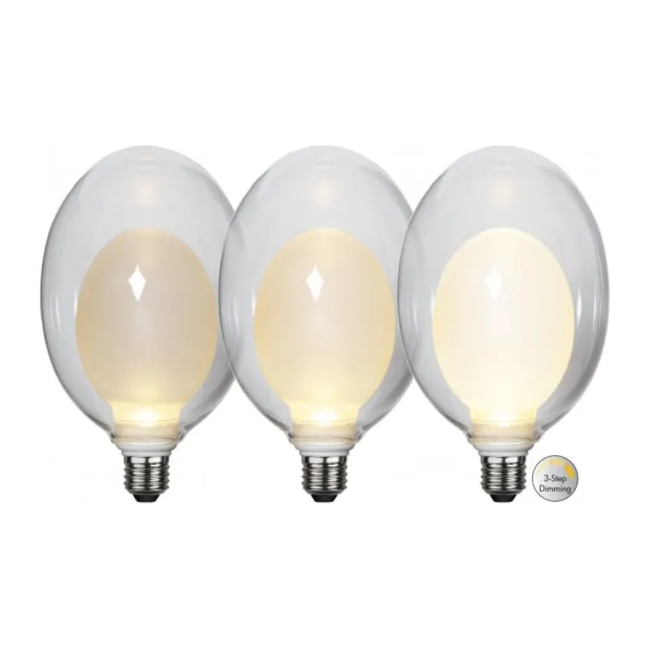 Dekorative Formlampe mit 3-Stufen-Klick-Dimmung! Die Helligkeit lässt sich einfach durch Ein- und Ausschalten des Netzschalters ändern. Wählen Sie zwischen 50lm, 200lm oder 350lm. Die Lichtfarbe beträgt 2700K und sie hat einen E27 Sockel. Beginnt immer mit der niedrigsten Helligkeit.