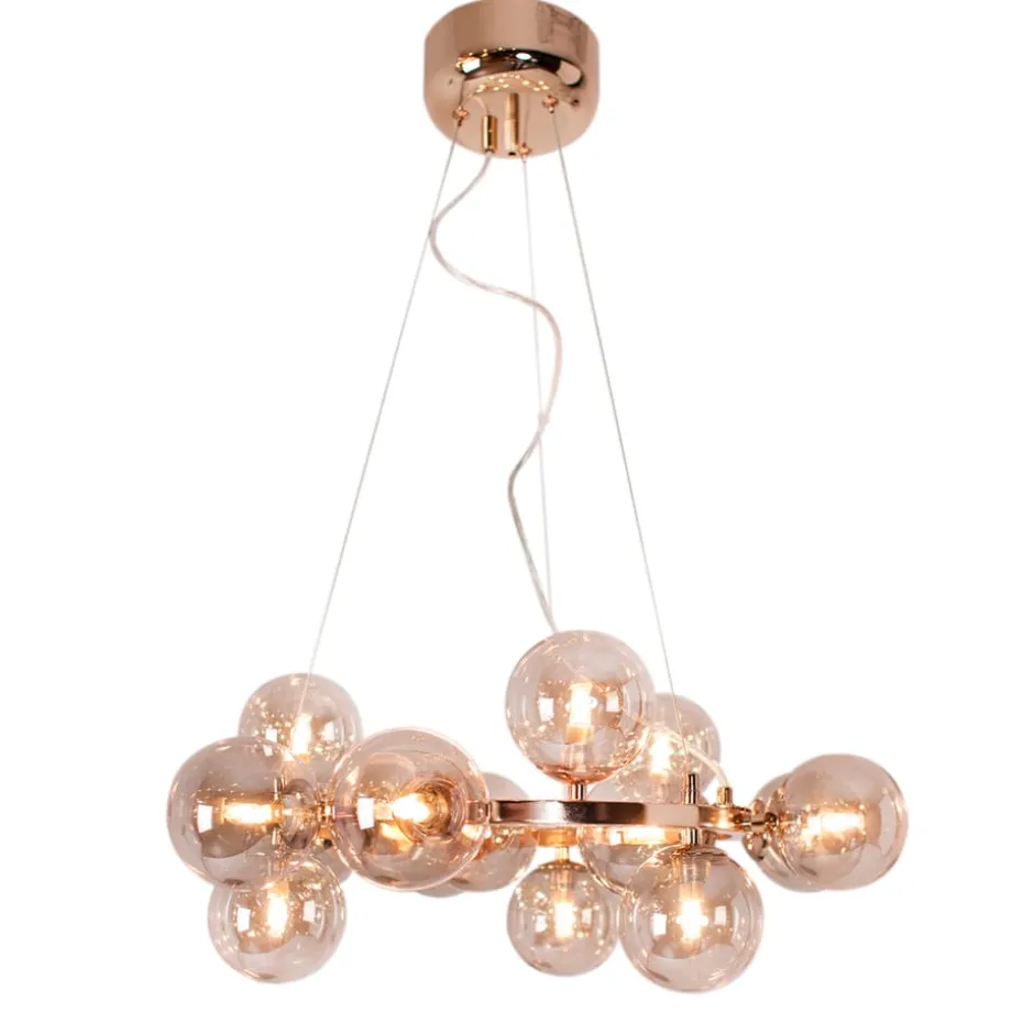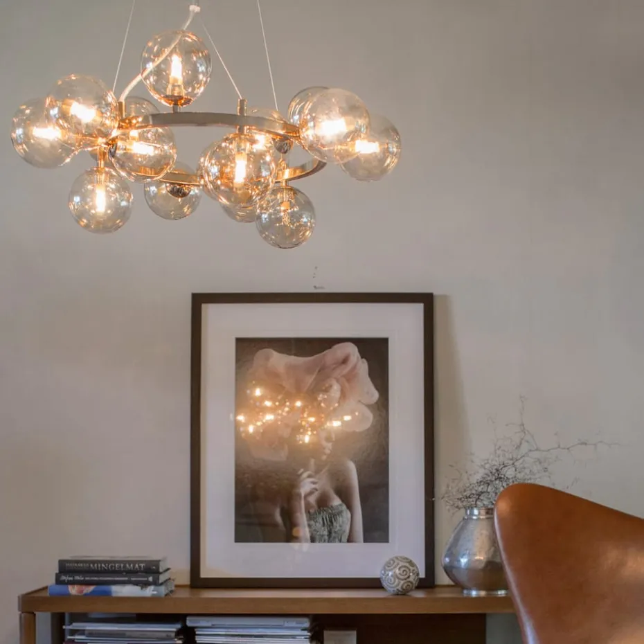Die Splendor Pendelleuchte ist eine moderne und verspielte Leuchte von By Rydéns mit Platz für bis zu 15 Lichtquellen, die im beleuchteten Zustand eine fantastische Atmosphäre im Raum verbreiten. Die Lampe ist eine moderne Variante eines klassischen Kronleuchters, bei dem der einfache Metallrahmen mit großen Glaskuppeln ausgestattet ist, die in Gruppen verteilt sind. Wählen Sie zwischen verschiedenen Farben. Lichtquellen und Deckensteckdose sind nicht im Lieferumfang enthalten.