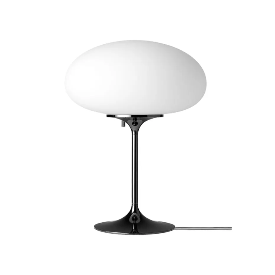 Die Stemlite Tischleuchte von Gubi ist eine Neuinterpretation des Originaldesigns des Designers Bill Curry aus dem Jahr 1962. Das Design der Stemlite ist typisch für die futuristischen Einflüsse der 60er Jahre im Design. Die Tischleuchten haben ein Gewicht, das im Fuß der Lampe verborgen ist, was dafür sorgt, dass sie trotz ihres großen, ovalen Glasschirms stabil steht.