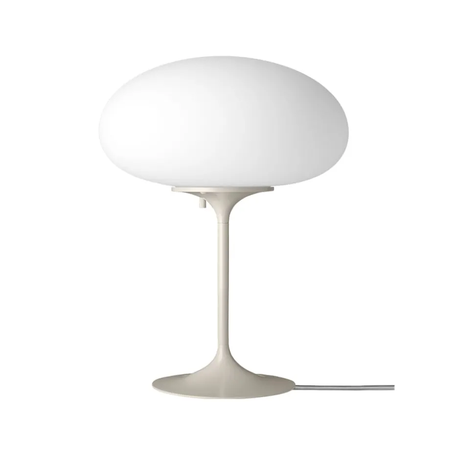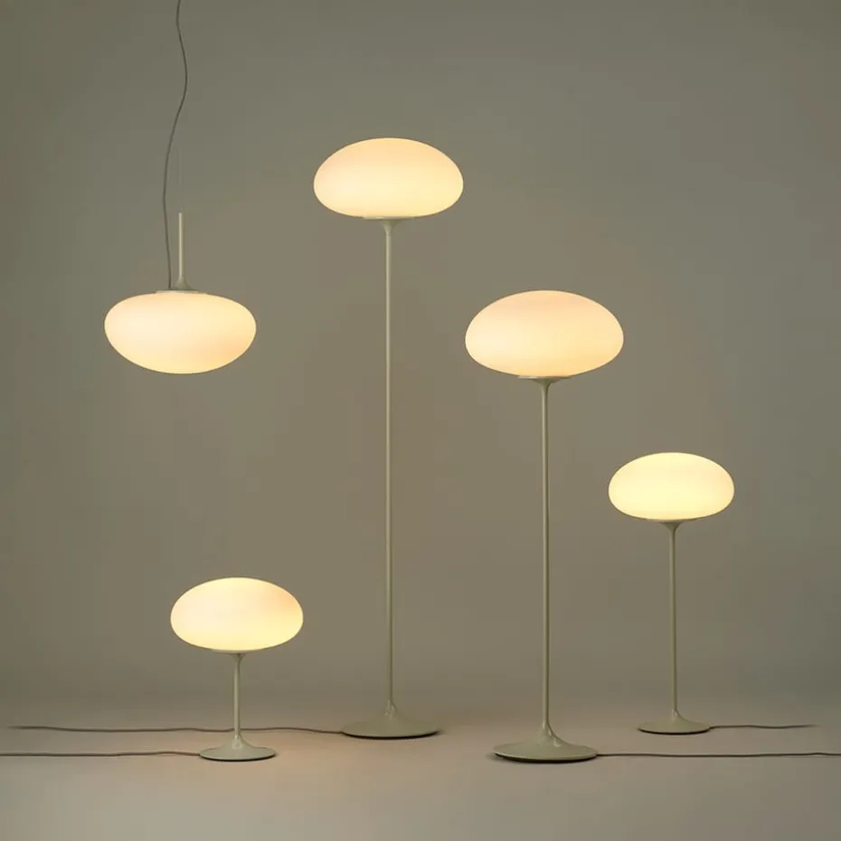 Die Stemlite Tischleuchte von Gubi ist eine Neuinterpretation des Originaldesigns des Designers Bill Curry aus dem Jahr 1962. Das Design der Stemlite ist typisch für die futuristischen Einflüsse der 60er Jahre im Design. Die Tischleuchten haben ein Gewicht, das im Fuß der Lampe verborgen ist, was dafür sorgt, dass sie trotz ihres großen, ovalen Glasschirms stabil steht.