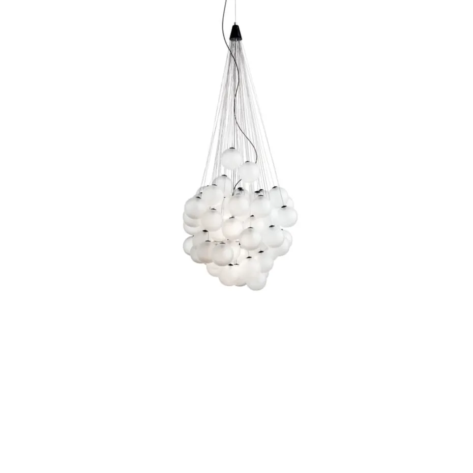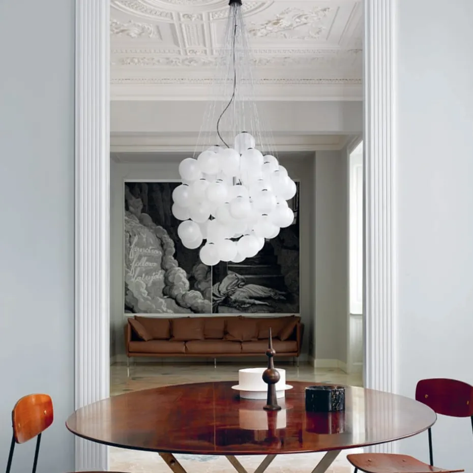 Die Stundastic Pendelleuchte von Luceplan, entworfen von Daniel Rybakken, besteht aus 48 oder 72 Glaskugeln, die an einzelnen Stahlseilen hängen. Die Glaskugeln sind in unterschiedlichen Höhen platziert, was eine verspielte und dekorative Komposition schafft. Dieses einzigartige Beleuchtungsdesign verwandelt jeden Raum mit seiner kreativen Ausstrahlung.
