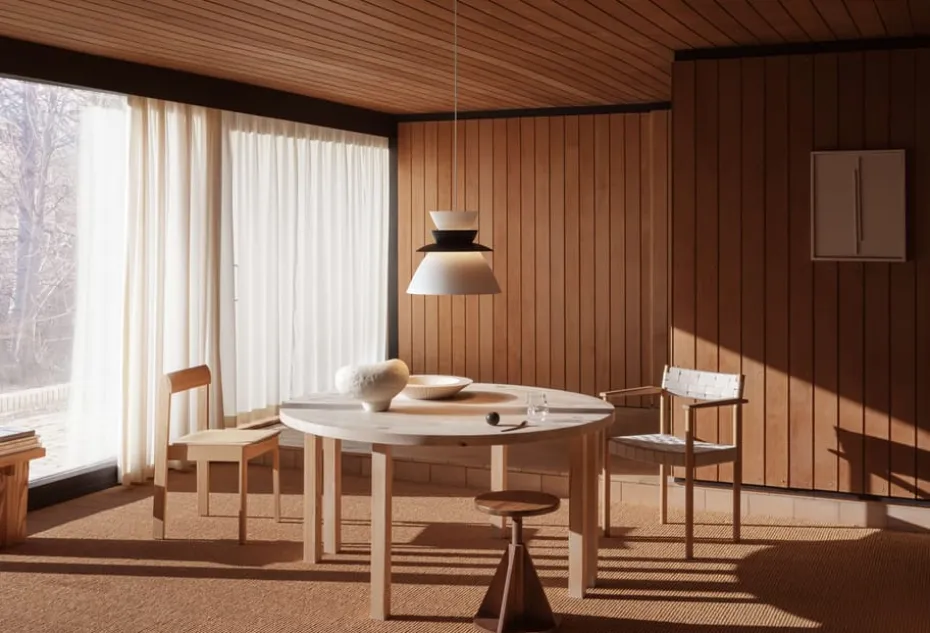 Die Sundowner 400 Pendelleuchte ist eine ikonische Lampe, entworfen von Jørn Utzon 1948, hergestellt mit vier Schirmen, die elegant die Form erhellen. Ihre weichen Kurven und entgegengesetzten Schirme zeigen eine deutliche Verbindung zu den einzigartigen Schalstrukturen, die seit mehr als einem halben Jahrhundert den Sydney Harbour schmücken.