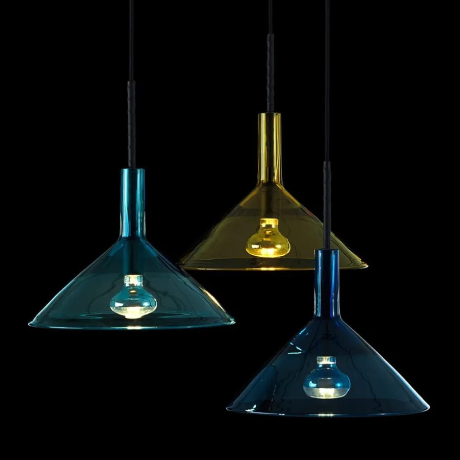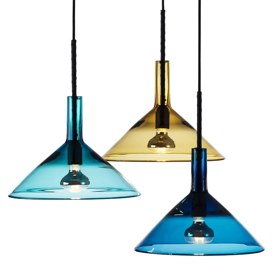 Die Tratten Pendelleuchte von Bsweden kombiniert stilvolles Design mit traditionellen Glasschmelztechniken aus Småland. Sie ist perfekt für sowohl private als auch kommerzielle Umgebungen. Mit Farben in variierender Intensität, geschaffen durch die Underfang-Technik, bietet jedes Exemplar einzigartige Nuancen. Das Mittelrohr ist sorgfältig mit vegetabil gegerbtem Leder aus der Tärnsjö Gerberei umwickelt, was eine unverwechselbare und natürliche Oberfläche verleiht. Diese Zusammenarbeit zwischen Gunnel Svensson und Anna Berglund resultierte in einem zeitlosen und schönen Leuchtkörper, hergestellt mit höchster Handwerkskunst im småländischen Örsjö.