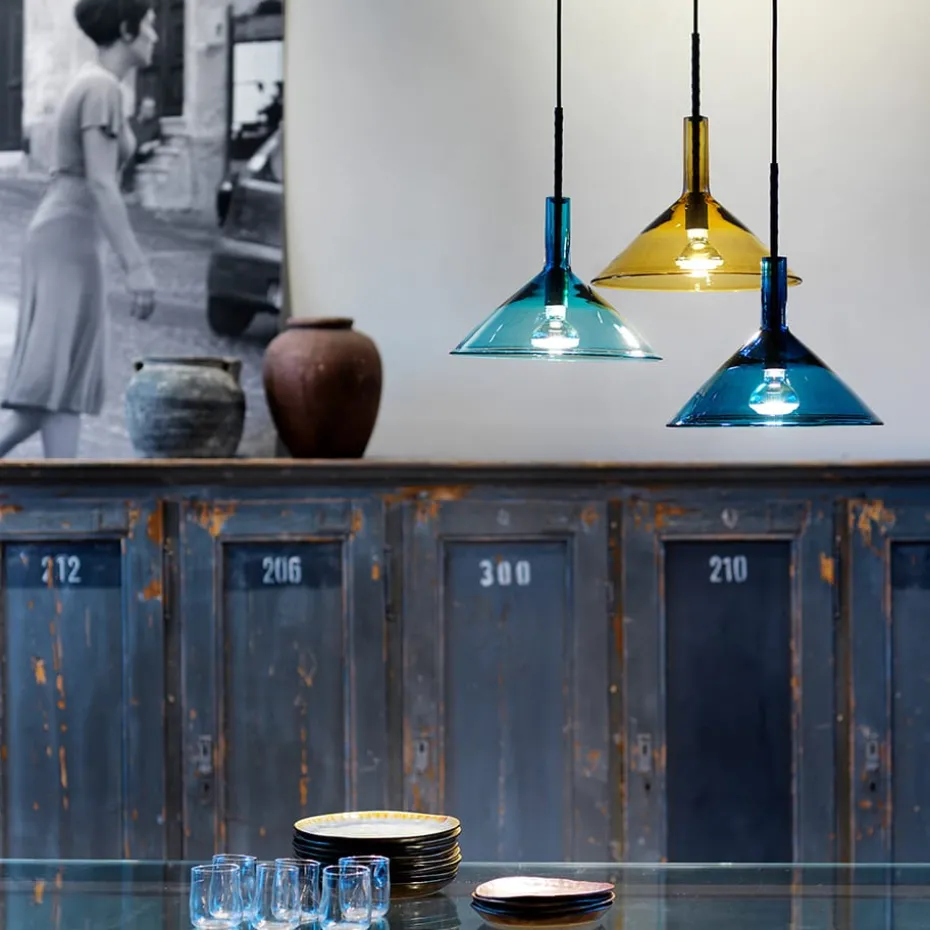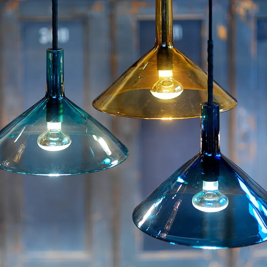 Die Tratten Pendelleuchte von Bsweden kombiniert stilvolles Design mit traditionellen Glasschmelztechniken aus Småland. Sie ist perfekt für sowohl private als auch kommerzielle Umgebungen. Mit Farben in variierender Intensität, geschaffen durch die Underfang-Technik, bietet jedes Exemplar einzigartige Nuancen. Das Mittelrohr ist sorgfältig mit vegetabil gegerbtem Leder aus der Tärnsjö Gerberei umwickelt, was eine unverwechselbare und natürliche Oberfläche verleiht. Diese Zusammenarbeit zwischen Gunnel Svensson und Anna Berglund resultierte in einem zeitlosen und schönen Leuchtkörper, hergestellt mit höchster Handwerkskunst im småländischen Örsjö.