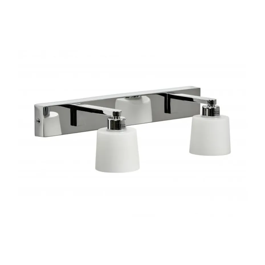Badezimmerbeleuchtung aus verchromtem Metall und mit zwei weißen Glaskuppeln. Lichtquellen nicht enthalten.