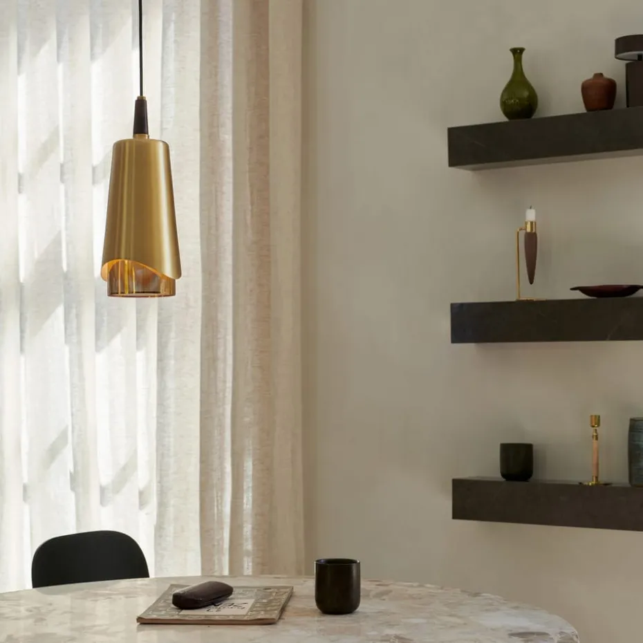 Die Umanoff Pendelleuchte von der dänischen Firma Audo Copenhagen ist eine zierliche und minimalistische Deckenleuchte, die sich hervorragend eignet, um über dem Küchentisch zu hängen – einzeln oder mehrere in einem spielerischen Cluster. Die Pendelleuchte wurde von Arthur Umanoff entworfen und strahlt ein weiches, nach unten gerichtetes Licht aus. Die Deckenleuchte besteht aus einem schlanken, glatten Außenschirm sowie einem Innenschirm mit einem perforierten Lochmuster, die zusammen ein stilvolles und elegantes Design schaffen.