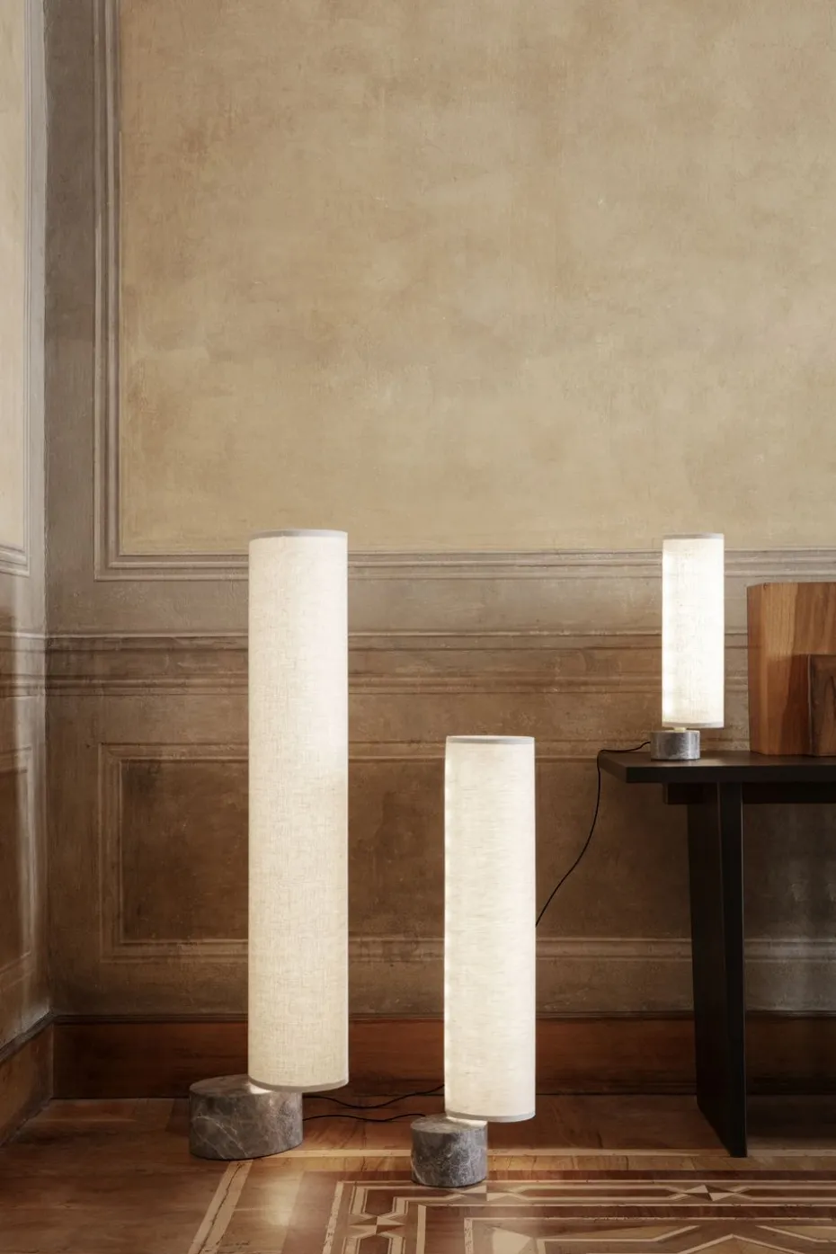 Die Unbound Stehleuchte 80 cm von Gubi hat eine Basis aus grauem Marmor und einen dimmbaren Lampenschirm, der um die Basis gedreht werden kann. Space Copenhagen steht für das Design, das die traditionelle Laterne interpretiert hat, und das Ergebnis ist die Unbound Stehleuchte, die gleichzeitig poetisch, verspielt und entspannt ist. Die dunkle und schwere Marmor-Basis steht im Kontrast zum hellen und leichten Material des Schirms, und wenn der Schirm gedreht wird, kann die Tischleuchte dem Betrachter die Illusion eines Segels auf einem Schiff vermitteln. Am Messinggestell, oder Mast wenn man so will, befinden sich mehrere LED-Lampen, die ein weiches, diffuses Licht erzeugen, das gleichmäßig verteilt ist.