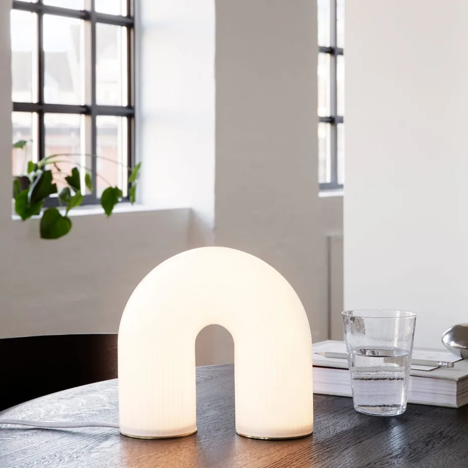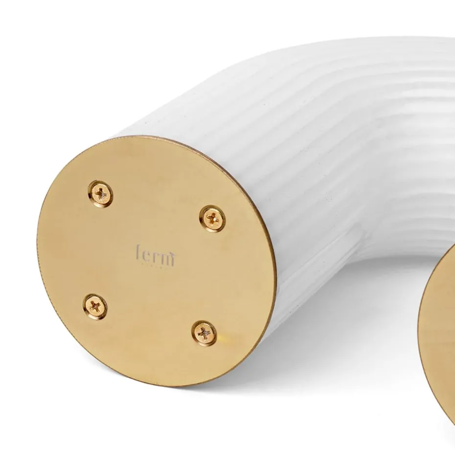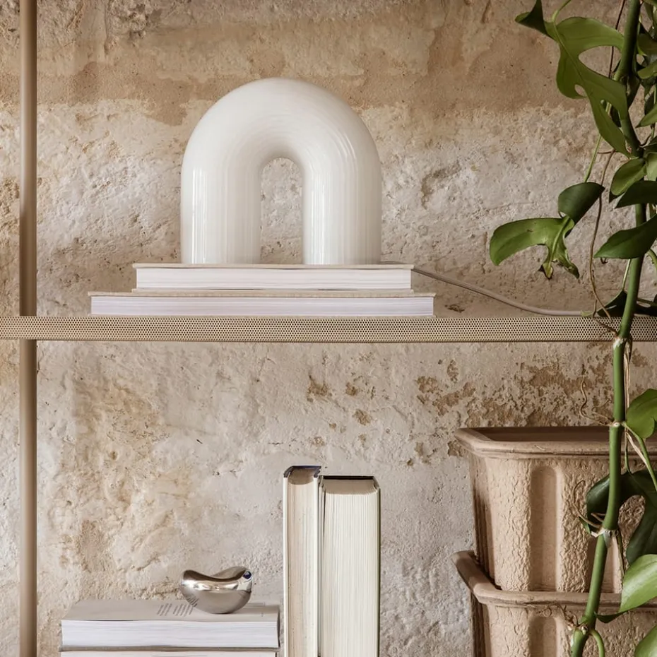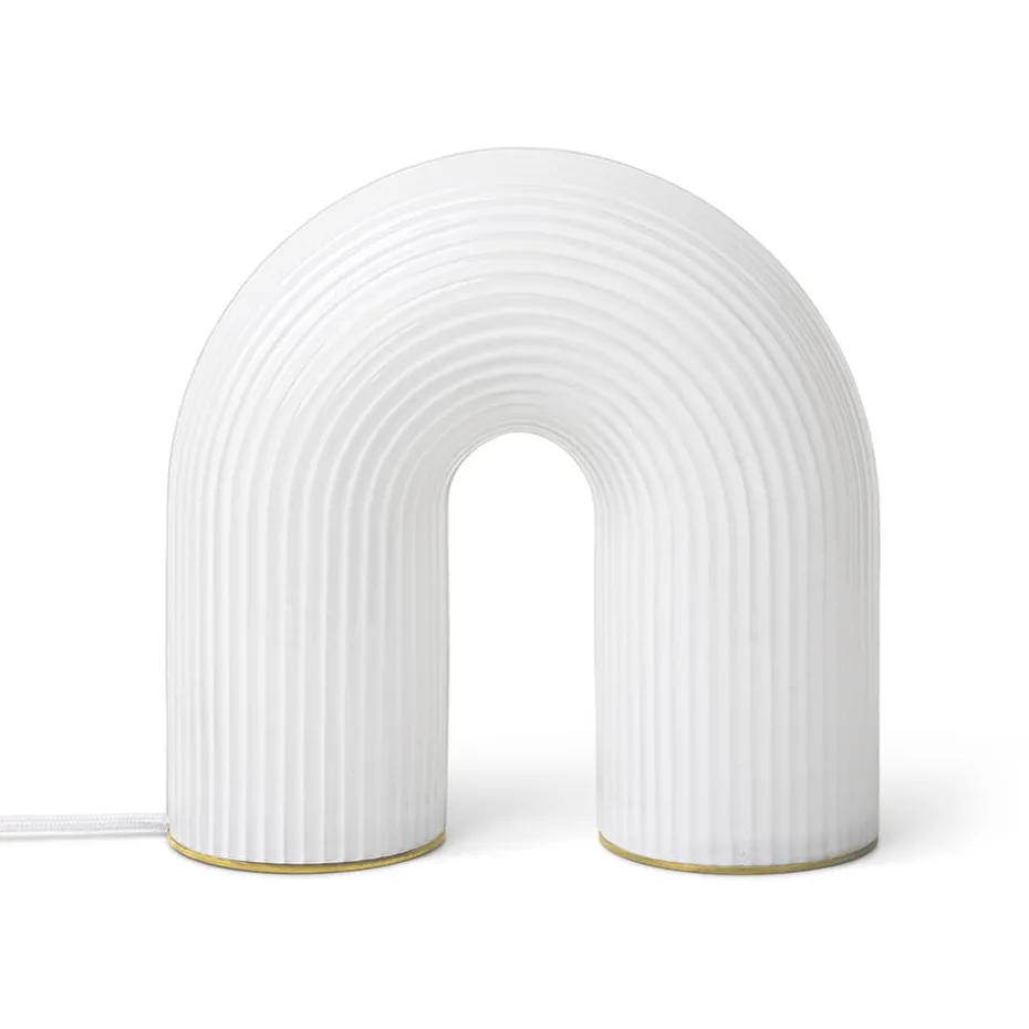 Die Vuelta Tischleuchte der dänischen Marke Ferm Living hat die Form eines skulpturalen Bogens, der an Architektur aus dem antiken Griechenland und dem Römischen Reich erinnert. Die Lampe besteht aus Glas und die beiden Beine stehen auf einem dünnen Messingfuß. Die Vuelta Leuchte verfügt über eine integrierte LED-Lichtquelle, die ein weiches und diffuses Licht ausstrahlt. Die moderne Tischleuchte hat auch einen einstellbaren Dimmer, so dass sie sowohl als dekorative Leuchte auf dem Schreibtisch als auch als Leselampe auf dem Nachttisch verwendet werden kann.