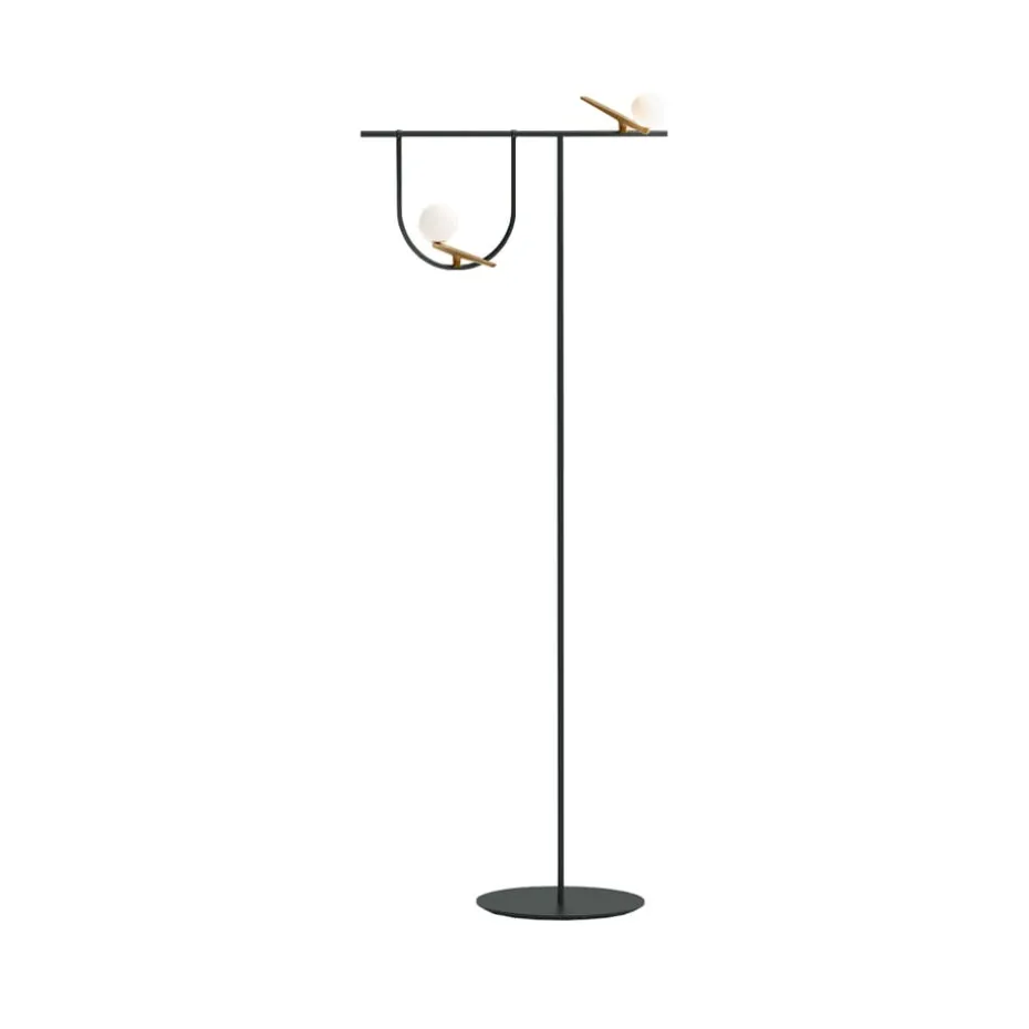 Die Yanzi F Stehleuchte von Artemide wurde von Neri & Hu entworfen. Diese Leuchte verbindet Tradition mit Innovation durch ihre grafischen Formen. Auf dem schwarzen Stahlständer sitzen vogelinspirierte Figuren mit einem Messingkörper und einem Kopf aus weißem Glas. Sie kombiniert warme und kalte Materialien, wodurch eine einzigartige Atmosphäre in Ihrem Zuhause entsteht. Dieses Kunstwerk erzeugt in jedem Raum ein schönes Licht.